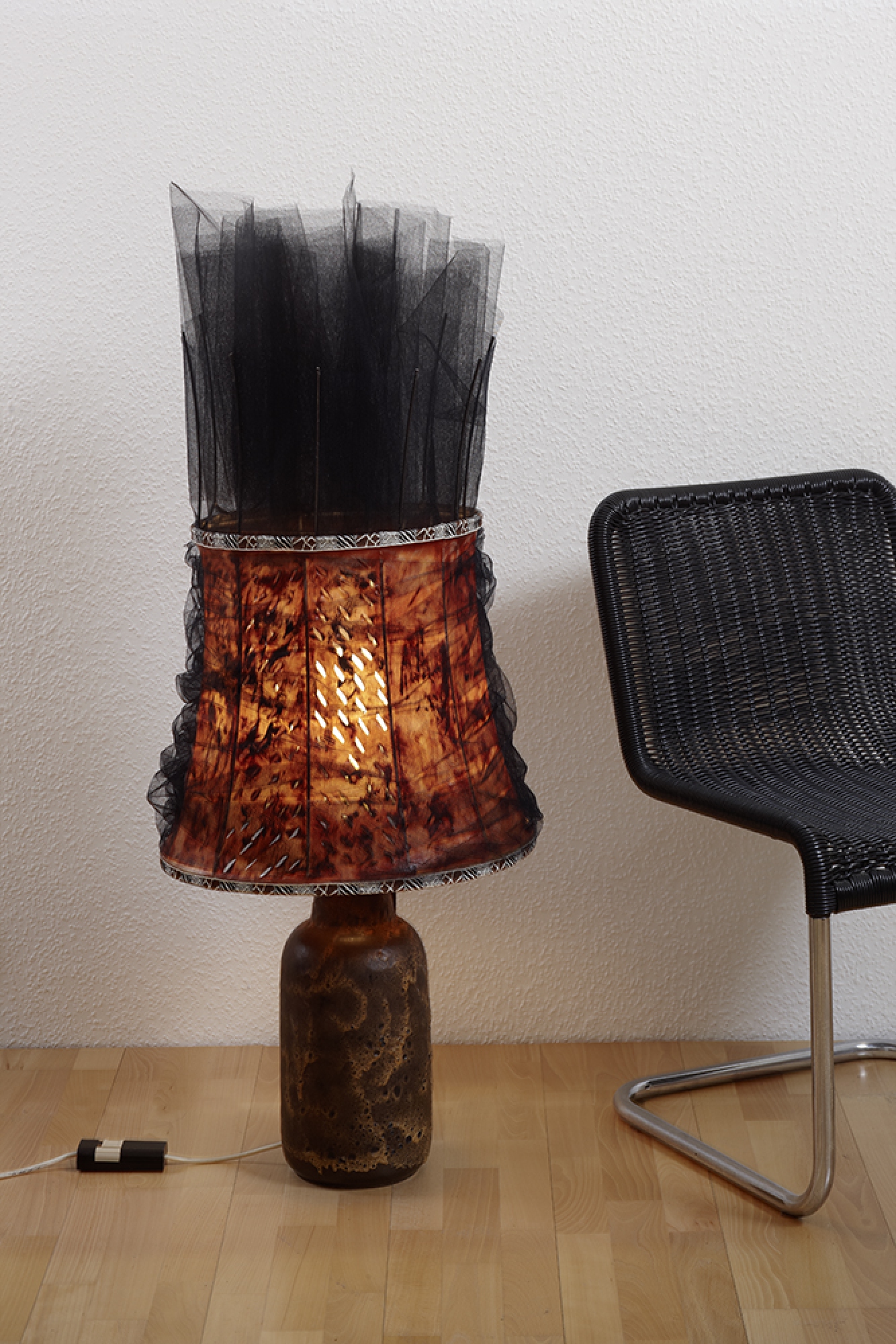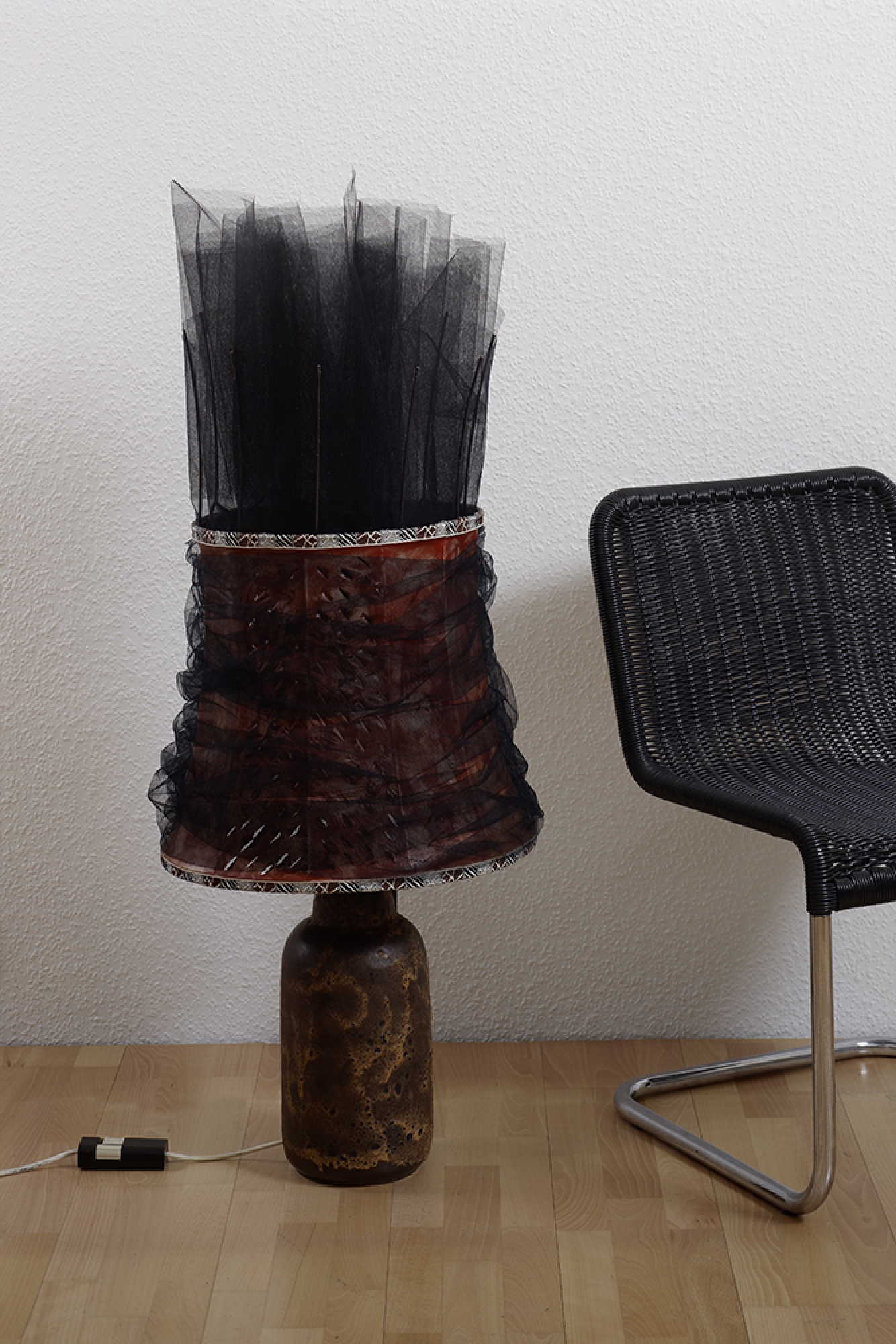 Material: Tüllstoff, Lampenschirm, Bordüre, Ölfarbe, Draht, Keramikfuß