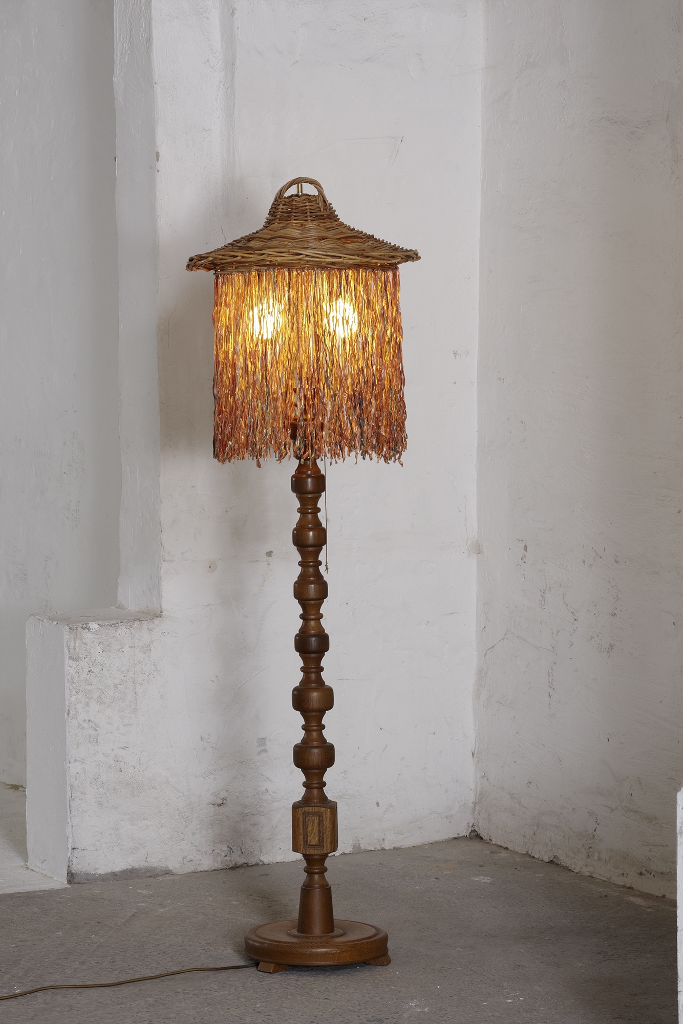 Material: Weidengeflecht, Textilbänder, Energiesparlampen, Holzständer