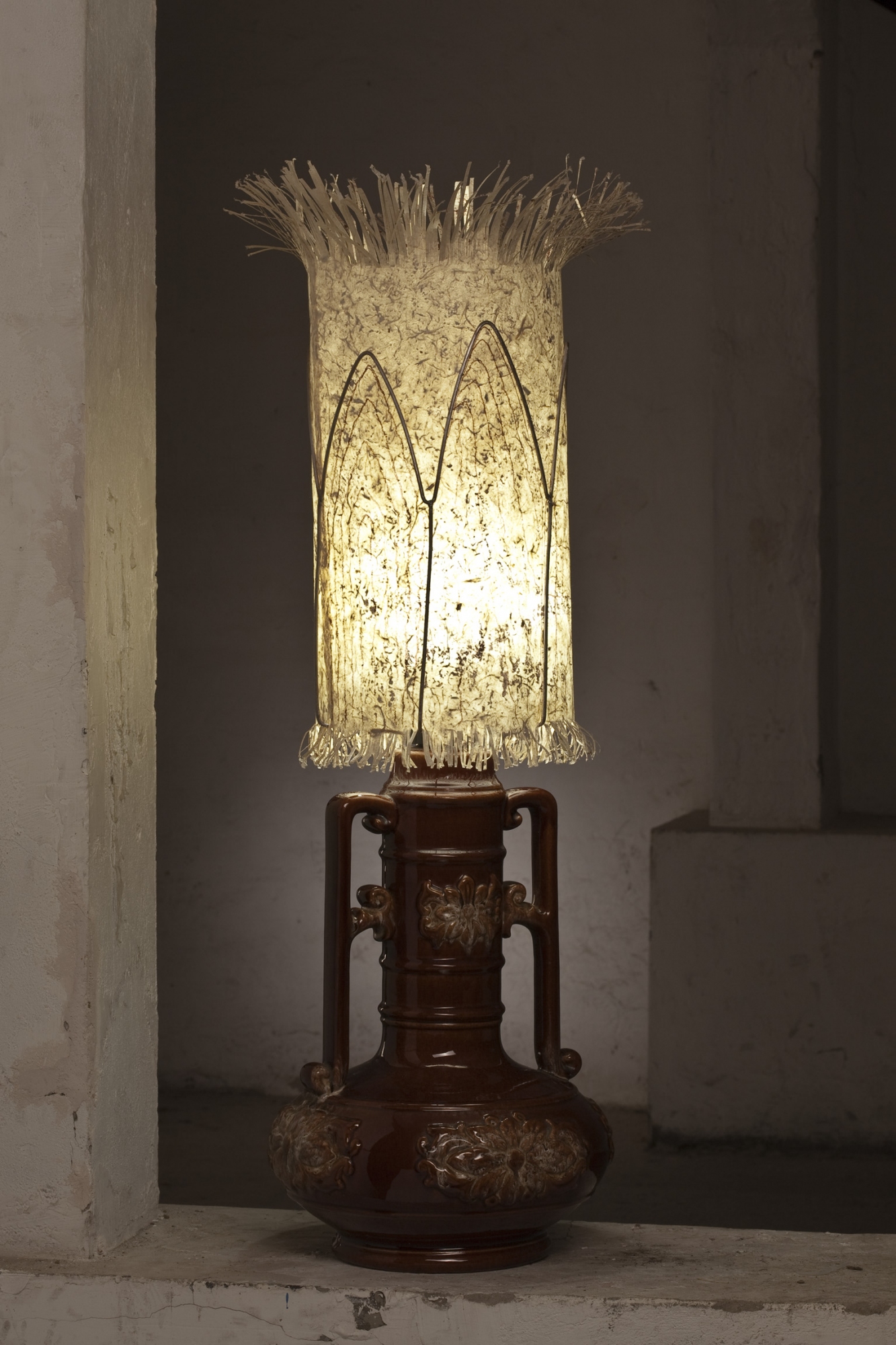 Material: Japanpapier, Pigmenttinte, Draht, Keramikfuß